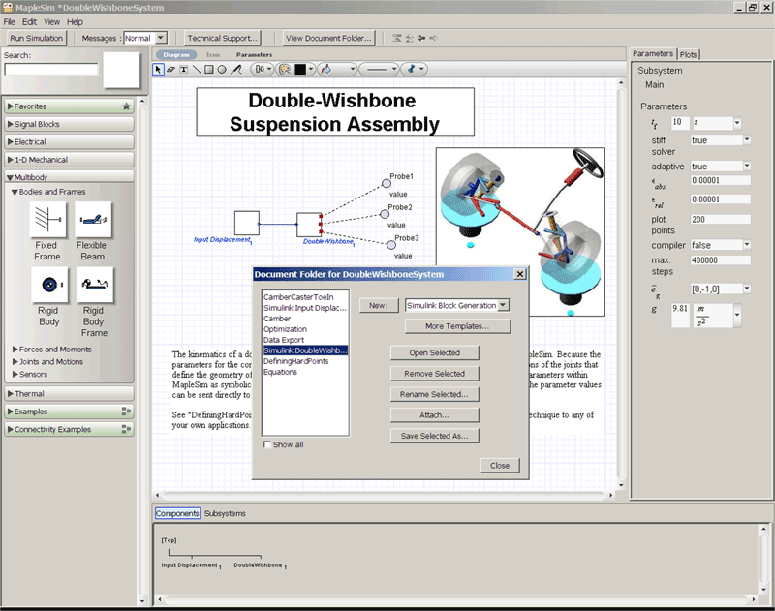 提供易於使用的 MapleSim 樣板,使用者可以非常直覺地一步一步設定參數及選項,瀏覽所產生的編碼,最後將模型輸出至 Simulink。