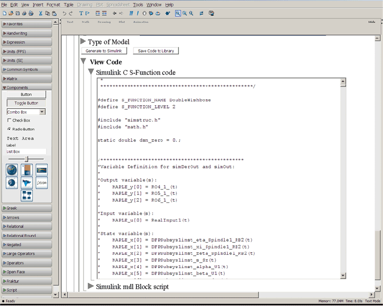 建立出來的 Simulink S-Function 模塊因為經過最新符號運算技術的化簡,所以執行的速度更快,透過 Simulink 及 Real-Time Workshop 將更容易達到 Real-Time 的需求: